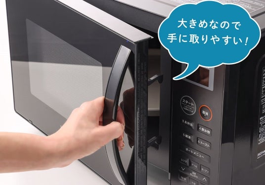 取っ手は大きめのサイズで、しっかりと握れて開け閉めがしやすくなっております。また、庫内はターンテーブルと回転テーブルを取り外した後に簡単にさっとひと拭きすることができ、清潔に保つことができます。取り外したターンテーブルと回転テーブルは水洗いすることが可能で、お手入れのしやすさも含めて使いやすい製品となっております。