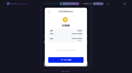 2 PayボタンをクリックするとFacewalletが立ち上がるので「今すぐ送信」をクリックし、PINコードを入力