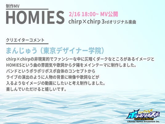 【空想・創造・共創】をキーワードとするポラポリポスポのコンセプトに基づき、未来ある若手クリエイターにMV映像制作を依頼しました。制作者名やコメントなどを公表することで、プロジェクトをさまざまな角度から支える各分野のパートナーに敬意を示します。また、制作の裏側を自ら発信することで、キャラクターに関わるプロの仕事の多様さを広く知ってもらうきっかけとなることを願い、今後のエンターテインメント業界のさらなる発展と継続可能な環境を目指しています。最新のモーション撮影技術によって作成したCG映像素材を、クリエイターが編集しやすい状態で提供します。クリエイターは、ポラポリポスポの各バンド(WAKAZO・chirp×chirp)のオリジナル楽曲を聴き込み、メロディや歌詞、演奏するバンドのキャラクターたちの背景情報などから、クリエイター自身が自由に解釈・創造し、フル尺のMV映像を制作します。