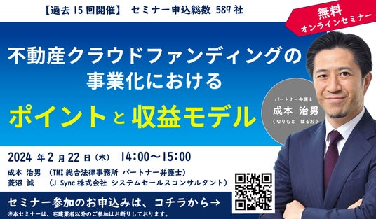 J Sync株式会社(東京都渋谷区、代表取締役:松本 英樹、以下「当社」といいます。)は、2024年2月22日(木)に「不動産クラウドファンディング」の事業化を検討する不動産事業者向けに【無料】オンラインセミナーを開催いたします。