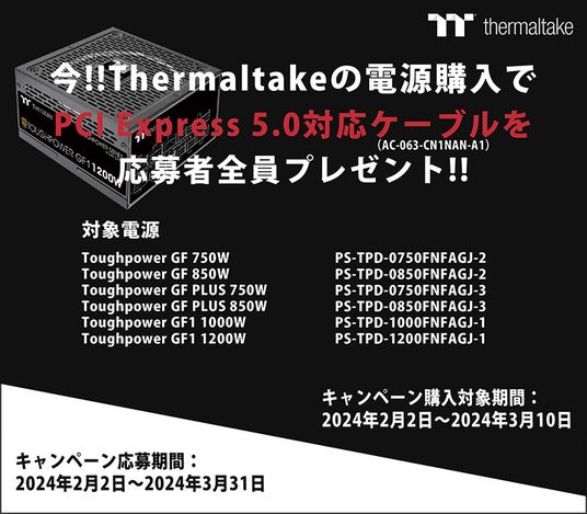 キャンペーン内容: 購入対象期間中に対象製品をご購入いただき、キャンペーン申込ページからご応募いただいた方全員に、Thermaltake社製電源ユニット用の12VHPWRモジュラーケーブル「Sleeved PCIe Gen5 Splitter Cable」をプレゼント