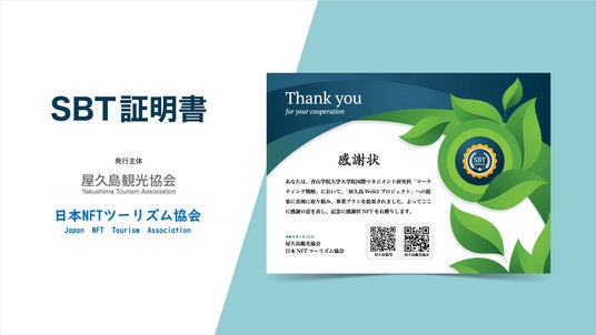 NFT×ツーリズムでツーリズム産業のアップデートに取り組む、一般社団法人日本NFTツーリズム協会(本社:東京都千代田区、代表理事:岩下 拓、以下:日本NFTツーリズム協会)と屋久島観光協会(所在地:鹿児島県熊毛郡、会長:後藤 慎)は、青山学院大学大学院国際マネジメント研究科(青山ビジネススクール)の「マーケティング戦略」授業内「屋久島Web3プロジェクト」への提案を行った学生に対して証明書としてSBT(Soulbound Token)を発行しました。