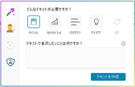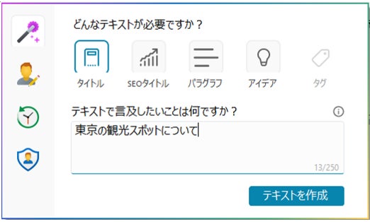 ・AIで素早くテキストを生成まるでChatGPTと会話をするように、少しだけのキーワードを与えるとAIがテキストを簡単かつ迅速に作成します。
