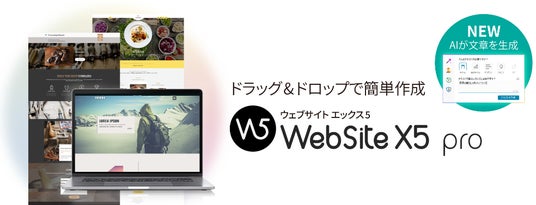 「WebSite X5 Pro」はコーディングの知識がなくてもウェブサイトを簡単に作成できるソフトです。ユーザーはドラッグアンドドロップでページの配置やデザインを簡単に設定できます。また、140種類のデザインテンプレートや100種類以上の素材・エフェクトでウェブサイトを自由にカスタマイズできます。写真ギャラリーや、お問い合わせフォーム、ショッピングカート機能などの高度な機能も簡単に追加できます。【 「WebSite X5 Pro」2023.2のAIツール 】