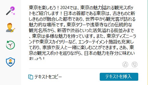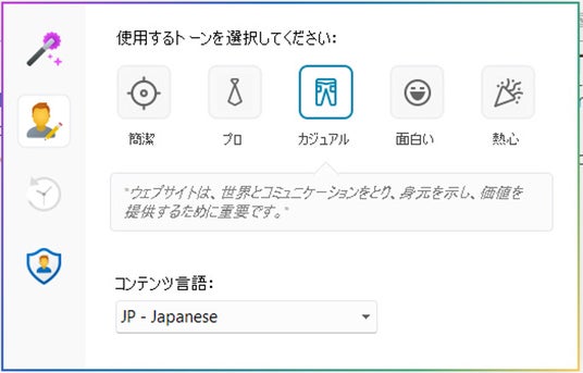・文章のトーンを変更できる生成された文章を、プロフェッショナル、カジュアル、簡潔など サイトのトピックやターゲットとする視聴者に応じて、適切なトーンに調整できます。
