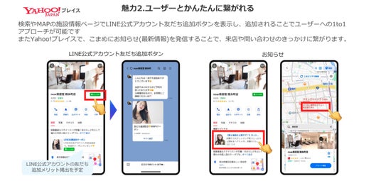 このサービスを利用し、情報の登録・更新をすると、「Yahoo!マップ」や「Yahoo!検索」を利用するユーザーがビジネスの営業時間や住所、電話番号のような基本情報から、お店の写真やメニュー、最新のニュースまで幅広い情報を確認することができるようになります。
