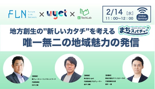自治体と民間企業をつなぎ、新しい価値を共に創り上げていく「公民共創」による社会課題解決を目指す株式会社地方創生テクノロジーラボ(本社:東京都港区、代表取締役社長:新井一真)は、株式会社フューチャーリンクネットワーク(本社:千葉県船橋市 代表取締役:石井丈晴)、株式会社uyet(本社:東京都渋谷区 代表取締役:金井洸樹、梶田大樹)と共同で、2024年2月14日11:00より「地方創生×VTuber」をテーマとし、ウェビナー「地方創生の”新しいカタチ”を考える~唯一無二の地域魅力の発信~」を開催します。