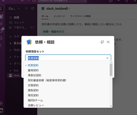 依頼タイプを選択、Slackのフォームを利用してSlackで契約書の作成依頼が可能です。ContractS CLMにログインせずとも普段使っているSlackから依頼ができます。