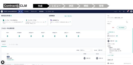 ContractS CLMは、契約プロセスの最適化と契約ライフサイクル管理を通して、業務効率化と生産性向上を実現する、契約ライフサイクルマネジメント(CLM)システムです。契約書作成、法務相談、押印申請、締結、保管、ステータス管理など、事業部から法務部まで様々な部署が関わる複雑な契約業務を、迷わずもれなく行うことが可能です。また、締結済みの契約書のドキュメント管理や更新管理に加え、締結前の契約書のステータス管理から契約書の変更・更新の履歴まで、契約のライフサイクル全体の管理を実現します。