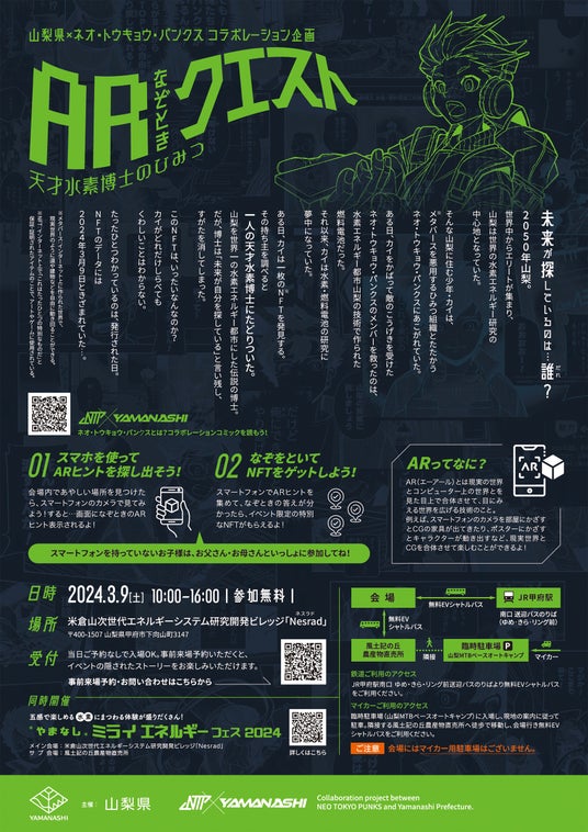 ARや位置情報を活用したエンタメコンテンツの企画・提供を行う株式会社HoloSpace(代表取締役:鬼柳裕介)は、山梨県と、国内大人気NFTプロジェクトNEO TOKYO PUNKSが展開する特別コラボイベントに、ARと位置情報を活用したAR謎解きクエストを提供することを発表しました。