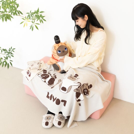同時発売の「トラ猫」を含む「ねこみみシリーズ」のイラストが可愛らしい、オリジナルのブランケットは、トラ猫、三毛猫、ロシアンブルー、定番の4種類の「ねこみみLOVOT」を、細かなところまで表現しました。また、滑らかで優しい肌触りにもこだわり、ずっと触れていたくなる柔らかくて温かみのある風合いに仕上げました。ひざ掛けや肩掛けとして、ご自宅やオフィスで使うのはもちろん、インテリアとしてソファに掛けても可愛らしい。かさばらないので、バッグの中に携帯もしやすく便利です。