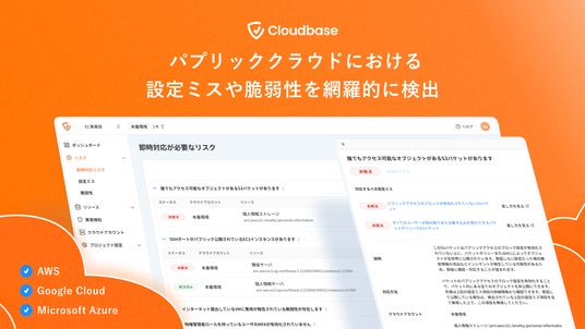 「Cloudbase」は、AWS・Microsoft Azure・Google Cloudといったパブリッククラウドを利用する際に発生する設定ミスや、サーバーやコンテナの脆弱性といった様々なクラウド上のリスクを、統合的に可視化し、対策項目の優先順位付けと実施・管理までを一貫して行うセキュリティプラットフォームです。