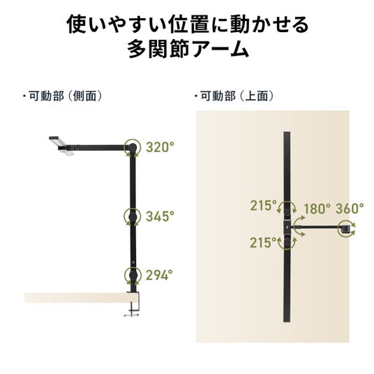 LED部は折りたためて180°方向調整ができ、アームとクランプ部は360°回転します。