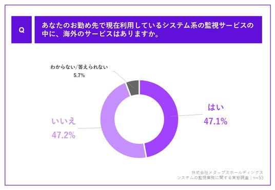 会社で1つ以上の監視サービスを利用している方に、「Q.あなたのお勤め先で現在利用しているシステム系の監視サービスの中に、海外のサービスはありますか。」(n=53)と質問したところ、「はい」が47.1%、「いいえ」が47.2%でした。