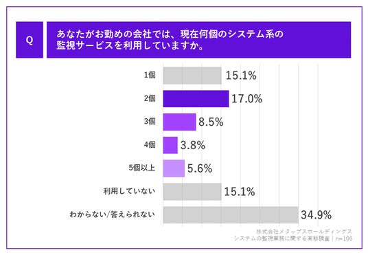 「Q.あなたがお勤めの会社では、現在何個のシステム系の監視サービスを利用していますか。」(n=106)と質問したところ、「2個」~「5個以上」の割合があわせて約35%でした。