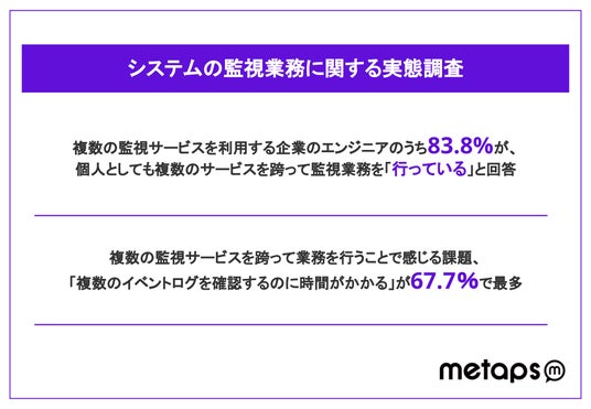DX支援を手掛ける株式会社メタップスホールディングス(渋谷区、代表取締役社長 山崎 祐一郎)は、ソフトウェアサービスを提供する企業のインフラエンジニア/SREエンジニア106名を対象に、システムの監視業務に関する実態調査を実施しました。その結果、会社で2つ以上の監視サービスを利用しているエンジニアのうち8割以上が、個人としても複数のサービスを跨って監視業務にあたっていることが分かりました。またそれによって、約7割の人が「複数のイベントログを確認するのに時間がかかる」と回答しました。