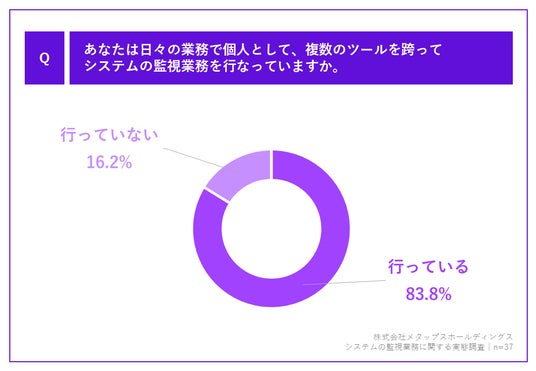 さらに、複数の監視サービスを利用している方に「Q.あなたは日々の業務で個人として、複数のツールを跨ってシステムの監視業務を行なっていますか。」(n=37)と質問したところ、「行っている」が83.8%でした。