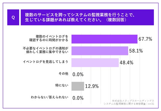 個人として複数サービスを跨って監視業務を行っている方に、「Q.複数のサービスを跨ってシステムの監視業務を行うことで、生じている課題があれば教えてください。(複数回答)」(n=31)と質問したところ、「複数のイベントログを確認するのに時間がかかる」が67.7%、「不必要なイベントログの通知が煩わしく業務に集中できない」が58.1%、「イベントログを見逃してしまう」が48.4%という回答となりました。