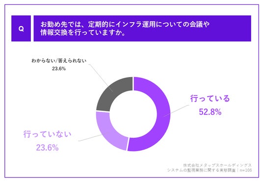 「Q.お勤め先では、定期的にインフラ運用についての会議や情報交換を行っていますか。」(n=106)と質問したところ、「行っている」が52.8%でした。
