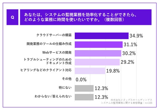 「Q.あなたは、システムの監視業務を効率化することができたら、どのような業務に時間を使いたいですか。(複数回答)」(n=106)と質問したところ、「クラウドサーバーの構築」が34.9%、「開発業務のツールの仕組み作成」が31.1%、「Webサービスの開発」が30.2%という回答となりました。