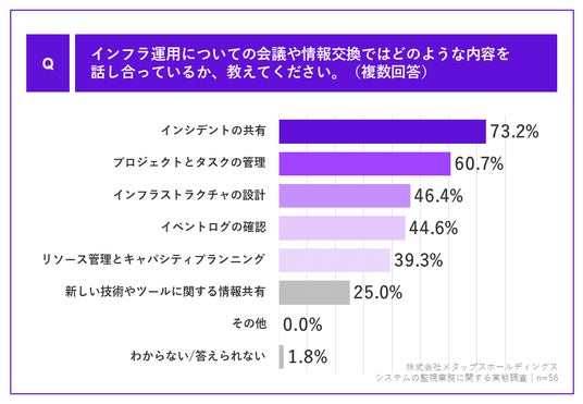 会議や情報交換を「行っている」と回答した方に、「Q.インフラ運用についての会議や情報交換ではどのような内容を話し合っているか、教えてください。(複数回答)」(n=56)と質問したところ、「インシデントの共有」が73.2%、「プロジェクトとタスクの管理」が60.7%、「インフラストラクチャの設計」が46.4%、「イベントログの確認」が44.6%という回答となりました。
