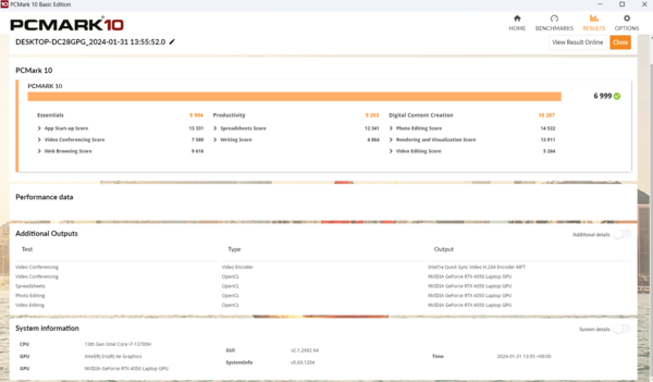 そこで、パソコンの総合性能をチェックできる「PCMark 10」を計測。結果は総合で6999となった。