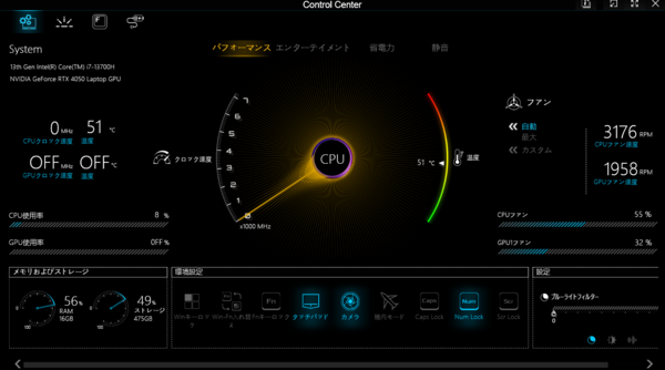 LEVEL-15FX155-i7-PLSXの主なスペックは、Core i7-13700H、GeForce RTX 4050、16GBメモリー、500GB SSDという構成だ。今回は、負荷の高いゲームプレイといった用途を想定しての計測なので、電源設定を「最適なパフォーマンス」に、「Control Center」での設定を「パフォーマンス」にして計測した。