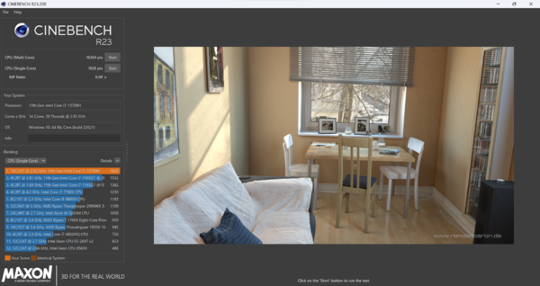 CPU性能が計測できる「CINEBENCH R23」では、マルチコアが16364pts、シングルコアが1820ptsという結果になった。モバイル向けではハイエンドに位置するCore Hシリーズを採用しているだけあって、スコアは高め。普段使いだけでなく、写真・動画編集といった作業もしっかりこなせそうだ。