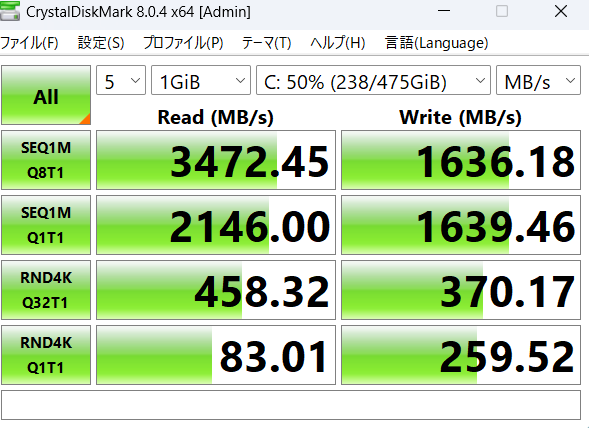 ストレージ速度は「CrystalDiskMark」で計測。結果は、シーケンシャルリードが3472MB/s、ライトが1636MB/sという結果に。最新の高速なストレージと比べるとそこまで速くはないが、ゲームプレイにおいては十分な速度だ。