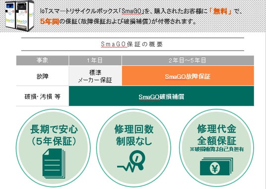 SmaGOのメーカー保証を1年から5年に延長!さらには三井住友海上火災保険(株)の協力のもと、従来難しかった屋外設置物への自然災害やその他偶然な事由による破損を対象とする5年補償の提供を開始します。
