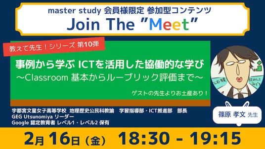 月2回、金曜日の18:30~19:00に Google Meet(TM) で開催中の「Join The “Meet”」。『教えて先生!シリーズ』は、特別回として15分拡大バージョン【18:30~19:15】でお送りします!
