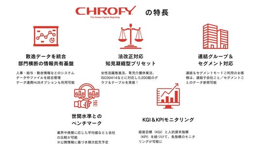 「CHROFY」は、企業内に散逸する勤怠/給与/人事評価など複数の人事関連データをもとにして統合データベースを構築し、それを可視化するサービスです。