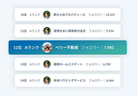 不動産各社アカウントの投稿動画の分析データにもとづく、不動産業界全体(国内のみ)のアカウント評価ランキングと自社アカウントのランクを一目で確認することができます。