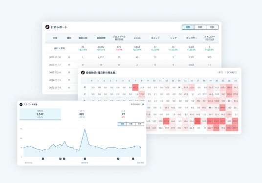 …日別・月別の動画視聴数やフォロワー数の変動をグラフで確認。過去との比較で成果の推移が明瞭。