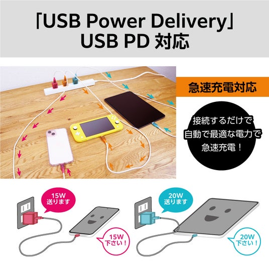 窒化ガリウム(GaN)採用により小型で軽量なACアダプタ。さらにUSB Poewer Delivery対応で最適な電力でより早く、安全に充電することができます。