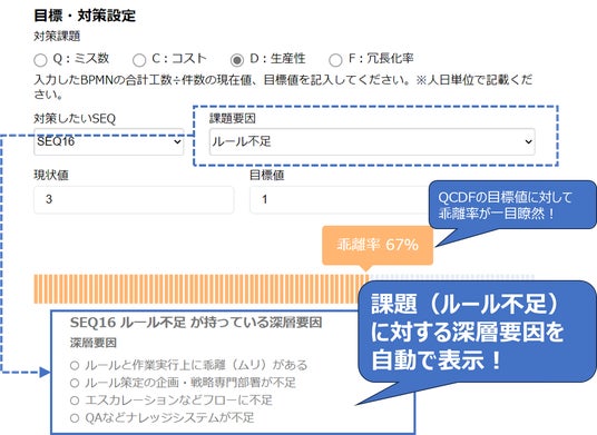 QCDF(品質・利益・生産性・体制)それぞれの目標値に対して、課題はなぜ発生してしまうのか、複数の深層要因を自動で可視化します。
