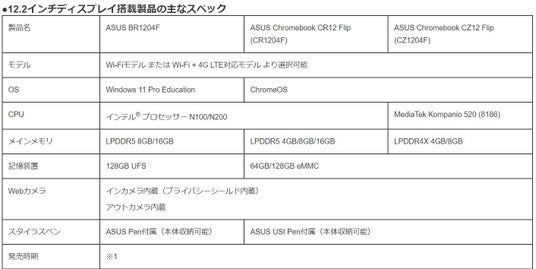 ASUS BR1204Fの製品情報:https://www.asus.com/laptops/for-students/br-series/asus-br1204f/(グローバル版製品ページ)