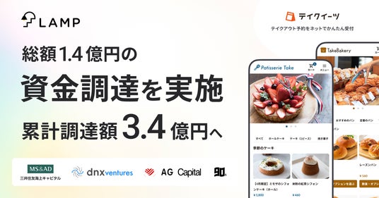 食品小売店や飲食店向けに全国1,500店舗以上へ導入のテイクアウトの予約受付・管理システム「テイクイーツ」を提供する株式会社ランプ(本社:京都市中京区、代表取締役:河野 匠)は西日本の企業へ初投資となるDNX Venturesをはじめ、AGキャピタル、90s、既存投資家である三井住友海上キャピタルを引受先とした第三者割当増資により、資金調達を実施いたしました。