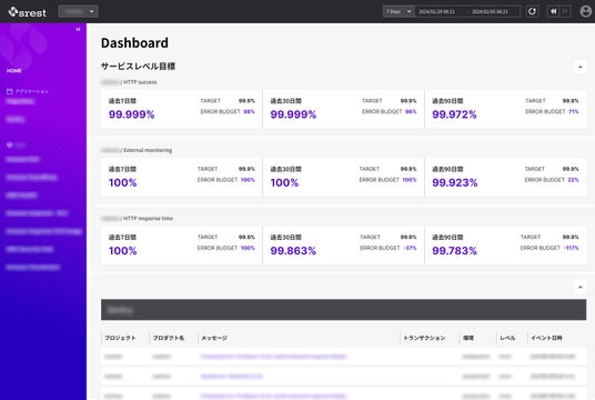 監視対象となるWebサービスのサービスレベル目標(SLO※2)をトップに表示します。ITインフラの全体像を瞬時に把握でき、オブザーバビリティ(可観測性)の実現を補助します。