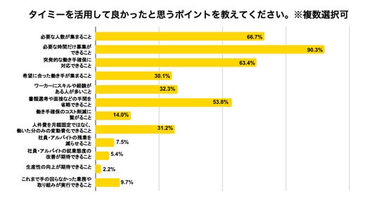 また、「必要な時間だけ募集ができること」「必要な人数が集まること」「突発的な働き手確保に対応できること」といった要素にご満足いただいていることが多いことが分かりました。