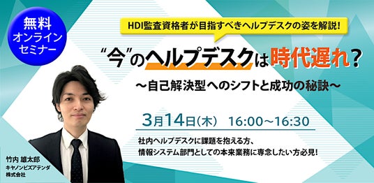 キヤノンマーケティングジャパン株式会社(本社:東京都港区、代表取締役社長:足立正親、以下キヤノンMJ)は、社内ヘルプデスクの目指すべき姿や課題解決法についてヘルプデスク監査資格者が解説する無料ウェビナー「”今”のヘルプデスクは時代遅れ?~自己解決型へのシフトと成功の秘訣~」を2024年3月14日(木)に開催します。