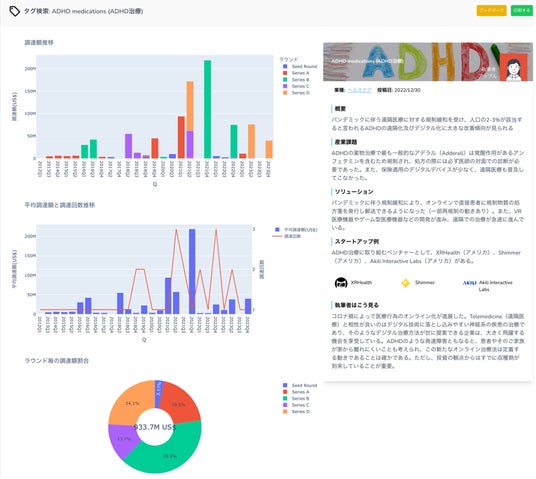 本機能では、弊社が指定する、例えば核融合技術やアンモニア燃料、ダークゲノムやAIOps等の注目サブセクター(ZUVAターゲットタグ)毎に紐づけられた代表企業の資金調達歴情報をもとに、対象サブセクター毎の資金調達トレンドや市場支配度、さらには今後の成長余地の予測が可能な各種グラフの閲覧が可能です。