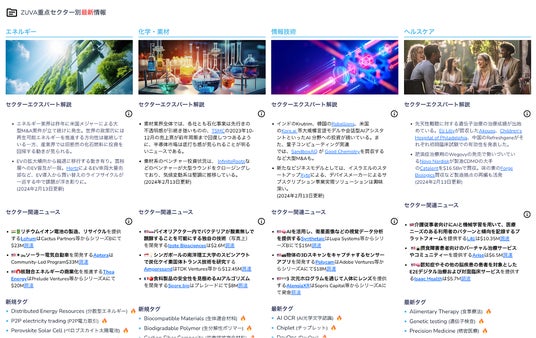 ZUVA、イノベーション創出における重点セクター(エネルギー、化学・素材、情報技術、ヘルスケア)毎の最新情報が集約されたダッシュボード機能およびサブセクターの可視化・分析機能を同時リリース