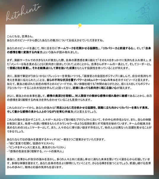 ”自分を知り、お互いを深く理解し合う”ライフジャーニーシェアリングツール「ヒトヒント」を提供する株式会社hitohinto(東京都渋谷区/代表:大野千香)は、2024年2月より、独自ロジックを用いたAIによって就活生の"自分だけの強み"を明確にする自己分析ツール「ヒトヒント PERSONAL」の提供を開始いたしました。