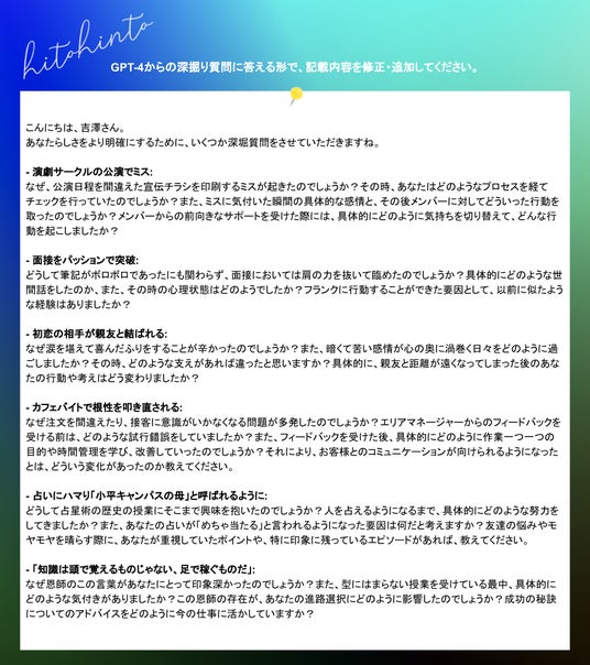「ヒトヒント PERSONAL」では、1000人以上の人生グラフを研究・分析することによって導き出された独自のロジック(特許出願済み)を用いて、GPT-4と連携した深掘り質問とフィードバック機能を提供しています。