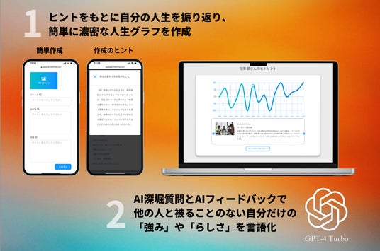 上記背景から、スマホ1つでスムーズに人生グラフを作成でき、さらにAIからの深掘り質問とフィードバックによって、根拠のある"自分だけの強み"を明確にする自己分析ツール「ヒトヒント PERSONAL」を開発いたしました。