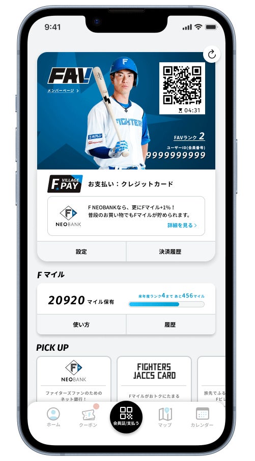 会員証を支払いタブに移動し、ホームタブに情報枠を拡張。会員証にはお気に入り選手が表示され、FビレッジPAYやF NEO BANKへの接続を強化いたしました。