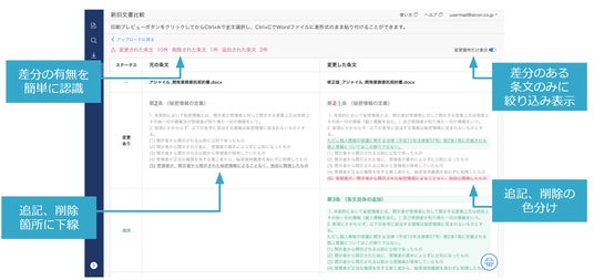 従来から多くのお客様からご好評いただいている文書比較機能が、お客様の声をもとに、さらに使いやすくなりました。主なアップデートは以下の通りです。