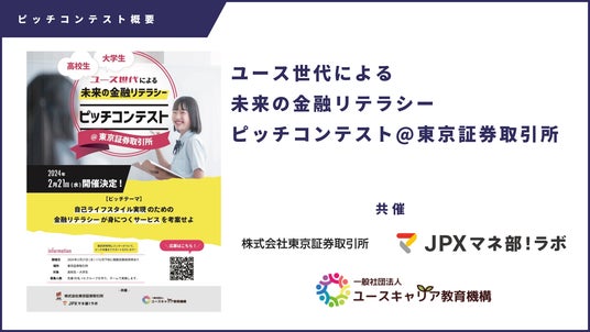 U29伴走支援型キャリアコミュニティ『Specialist』等を運営する一般社団法人ユースキャリア教育機構(本社:東京都中央区 代表理事:宇野晋太郎、以下「当機構」)は、株式会社東京証券取引所(本社:東京都中央区 代表取締役社長:岩永守幸、以下「東証」)と共催で、2024年2月21日(水)に若者のファイナンスリテラシー(金融リテラシー)を向上することを目的とするビジネスピッチコンテスト「ユース世代による未来の金融リテラシーピッチコンテスト」(以下「本コンテスト」)を東京証券取引所にて開催いたします。