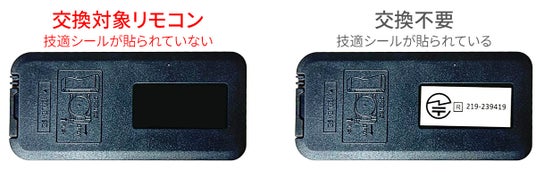 製品に付属しているリモコンの裏側に『技適シール』が貼られていないものが交換対象です。